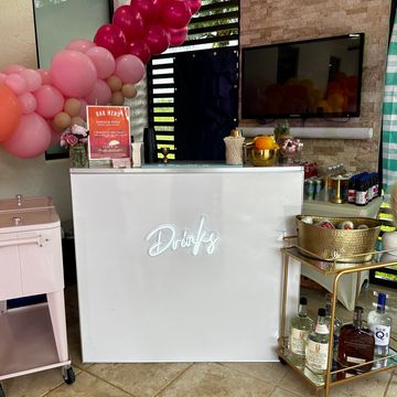 Our white bar is perfect for any celebration, the white sleek look creates a modern and eye catching vibe that will go perfectly with any decoration.